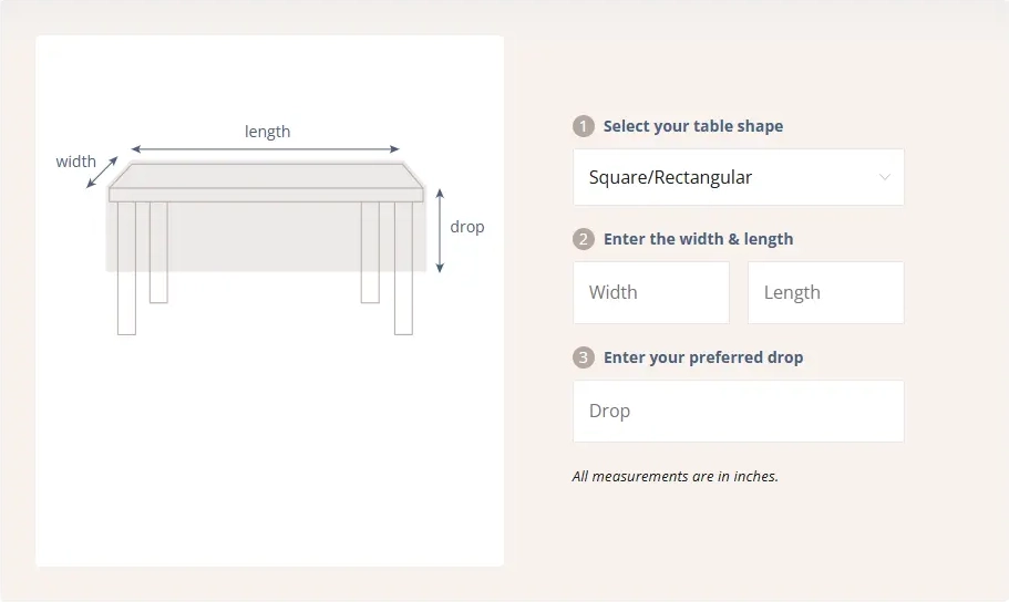 Our easy-to-use Tablecloth Sizing Calculator takes the guesswork out of ordering a perfectly fitted tablecloth. Just input your table’s measurements, and we’ll provide you with exact sizing recommendations tailored to your specific table and desired drop length.